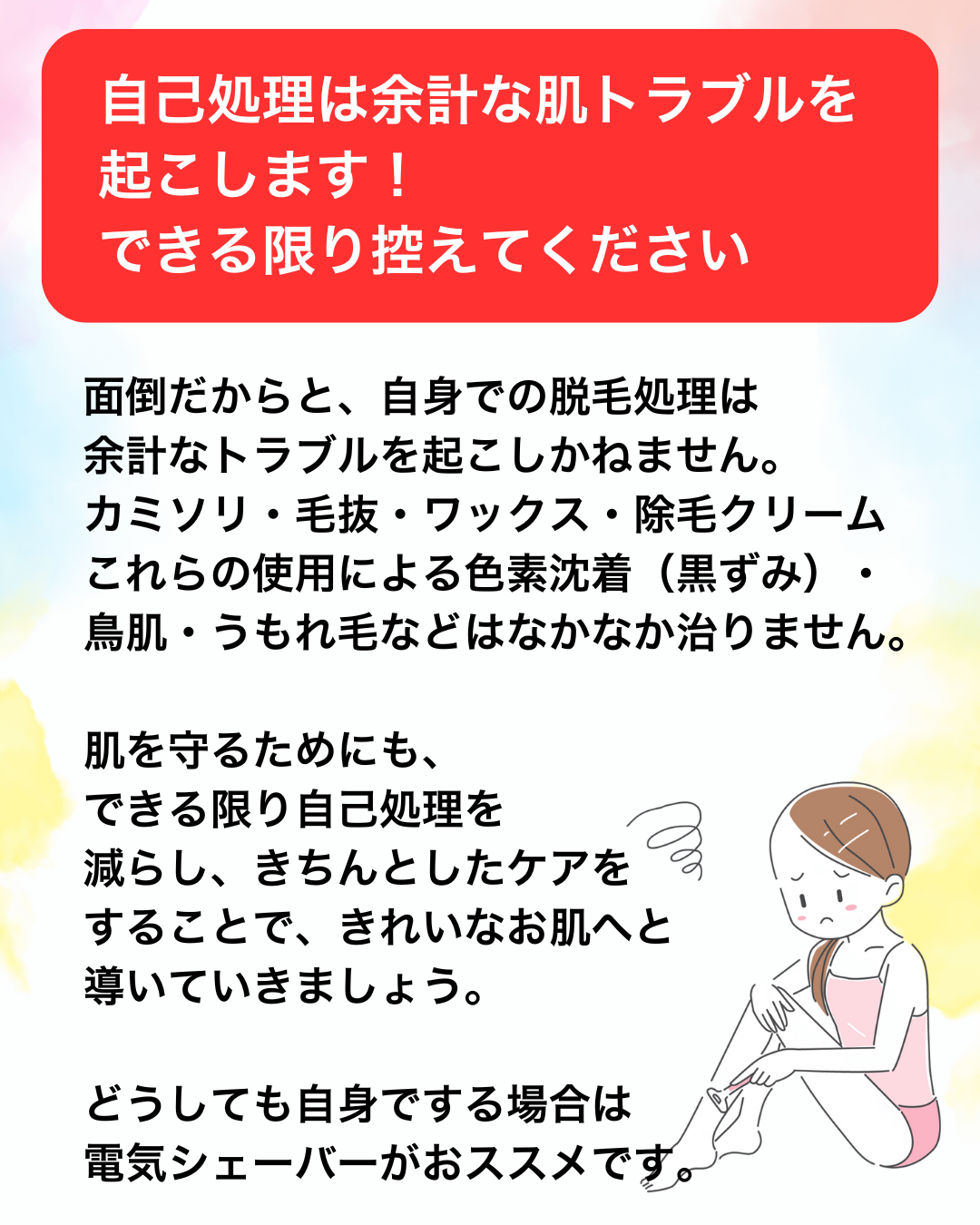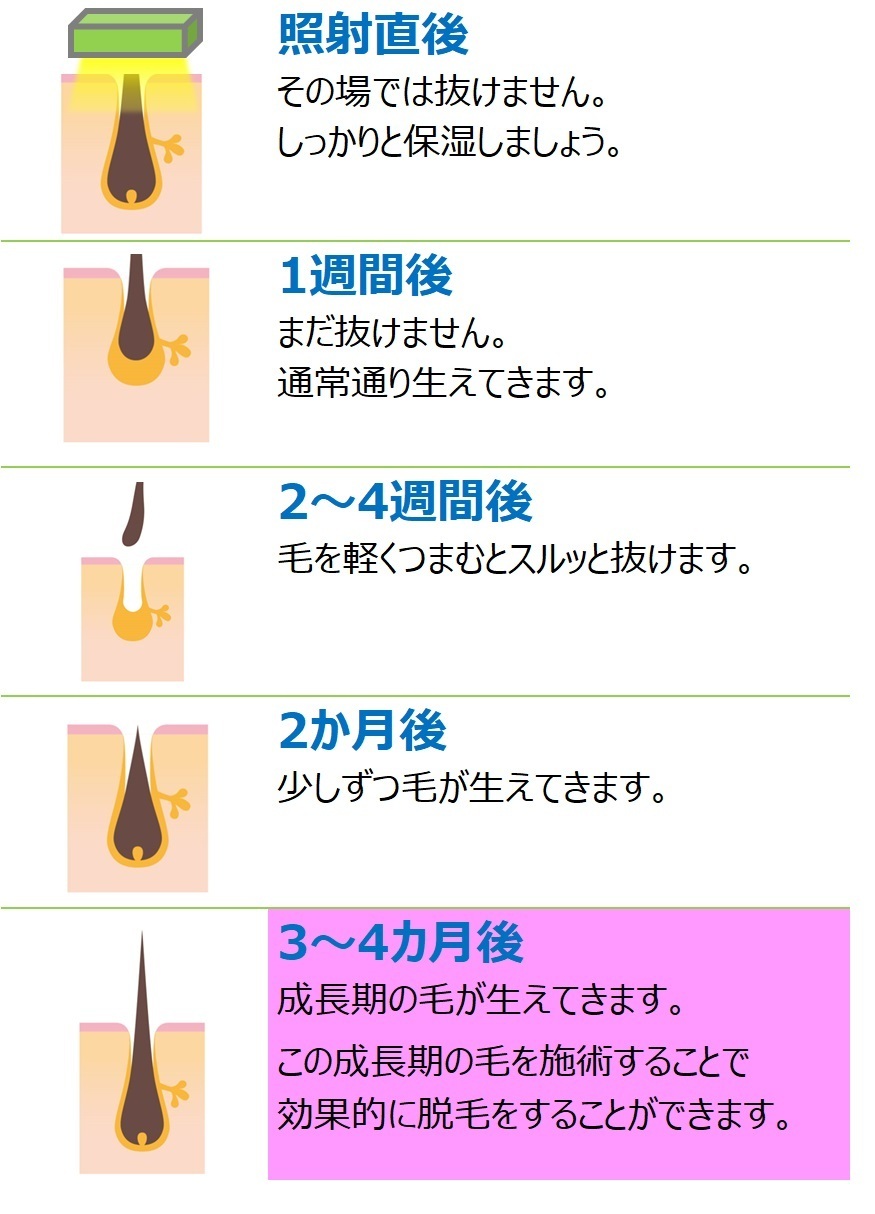ほとんどが産毛ですが、まれに太い毛が生える場合もあります。産毛には効果が分かりづらいこともありますが、回数を重ねてツルツル肌になると、透明感が増します。